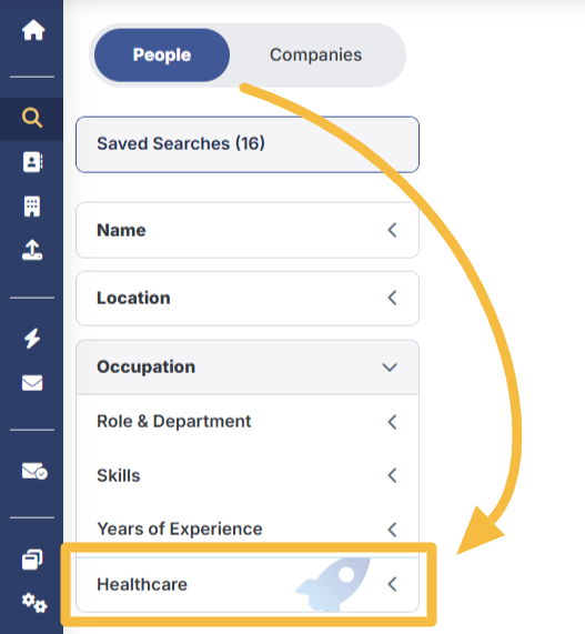 Login to RocketReach, navigate to the People Search page, and locate the Healthcare filter group. It is located within the Occupation category, you may need to scroll down to see it.